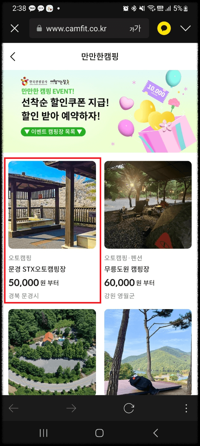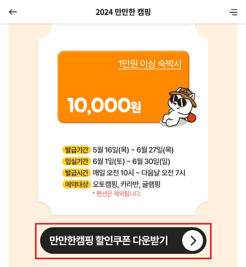 - 쿠폰 사용방법 : 원하는 캠핑장 선택 후 예약 진행 → 할인쿠폰 다운로드 → 결제 전 "할인 적용"에서 만만한 캠핑쿠폰 적용